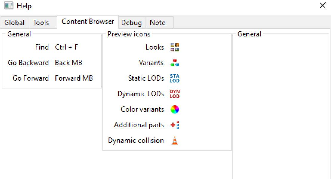 Значения этих значков можно найти в Редакторе карты, если открыть пункт меню Help и в открывшемся окне перейти на вкладку Content Browser.